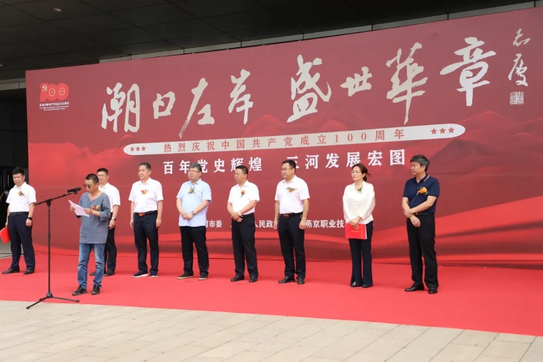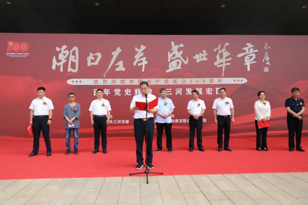 为庆祝中国共产党百年华诞,全面展现新时代三河市取得的发展和建设成就,7月10日上午,由三河市委、市政府主办、金年会app手机版在线登录承办的“潮白左岸 盛世华章”书画展于三河市文化中心顺利开展。三河市委书记刘连杰出席并宣布开幕。廊坊政协副主席、河北省书协副主席张纬东,河北省美协副主席、廊坊市美协主席张玉华,民盟廊坊主委、廊坊市文联主席张志庆,廊坊市书协主席刘京闻,三河市委常委、宣传部长李志英,金年会app手机版在线登录党委书记薛树林等领导以及三河市书协成员、三河市美协成员、金年会app手机版在线登录学院领导和教师代表等200余人出席了本次开幕式。开幕式由廊坊金年会app手机版在线登录职业技术学院院长孙东辉主持。