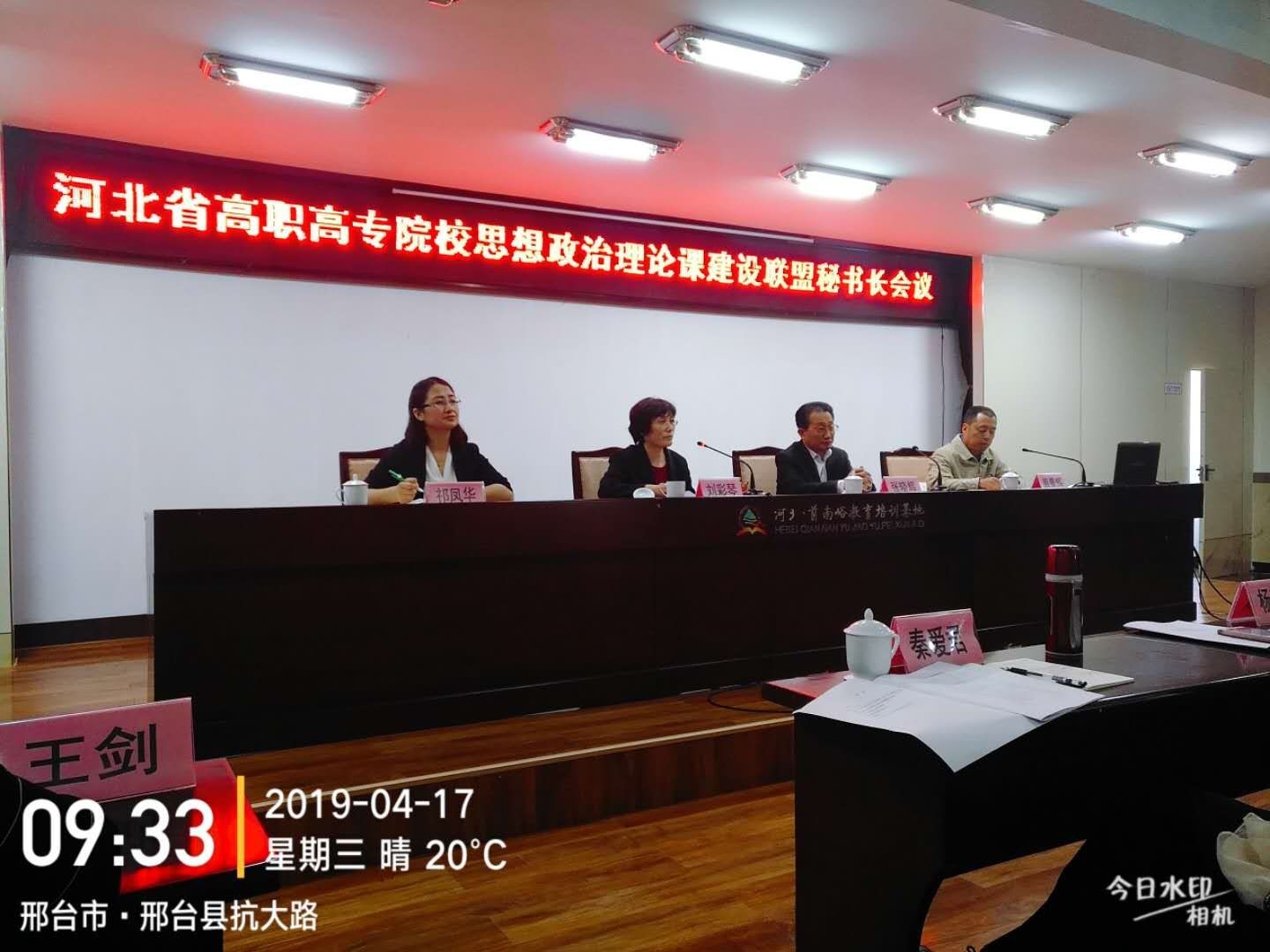 4月16至19日,由河北省高职高专院校思政课建设联盟主办,河北机电职业技术学院承办的河北省高职高专院校思想政治理论课建设联盟2019年秘书长会议在邢台市邢台县前南峪宾馆召开。作为联盟理事单位,金年会app手机版在线登录公共教学部主任李树晗教授、张淼老师与全省30所高职高专院校的代表参加了此次会议。