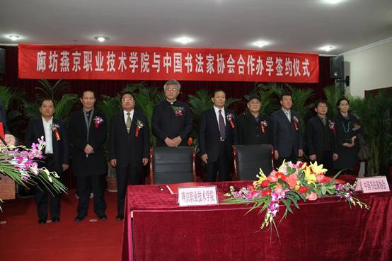 2011年12月12日下午,金年会app手机版在线登录与中国书法家协会合作办学签约仪式在培训楼会议室隆重举行。中国书法家协会分党组书记赵长青,金年会app手机版在线登录党委书记、三河市委书记张金波出席签约仪式并分别致辞,郭洪博院长,中国书法家协会理事、军事博物馆书画院常务副院长、书法家李洪海,中国书法家协会理事、首都师范大学博士生导师、书法家叶培贵,中国书法家协会理事、中国石油书法家协会执行副主席、秘书长于恩东,中国书法杂志社常务副社长郭志鸿,中国书法家协会会员、中国美术家协会会员、中国诗书画协会副会长、中国艺术研究院访问学者、中国书法杂志社事业发展部主任肖映梅,学院党委副书记孟实,副院长张玉青等领导、嘉宾及金年会app手机版在线登录教师代表出席了签约仪式。