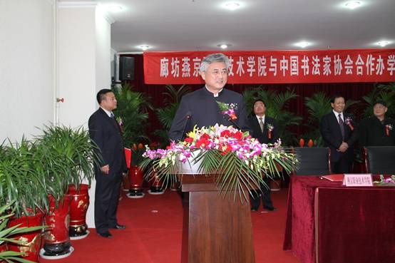 学院党委书记张金波在仪式上致辞。他说,今天学院与中国书法家协会签署合作办学协议、共建书法专业,前景广阔、恰逢其时。这是学院对外合作发展史上的一个里程碑,不仅有助于学院拓宽办学空间,深化教学改革,强化师资建设、提高办学水平,也是双方进行资源共享、合作共赢、举办特色专业的有益尝试。他表示,在双方的真诚合作与共同努力下,双方的合作关系将更加密切,合作领域将不断拓展,合作水平将不断提升,一定可以培养出更多的书法艺术专门人才,为新时期书法艺术的普及、提升奠定良好的基础,为弘扬中华传统文化艺术贡献自己的力量。