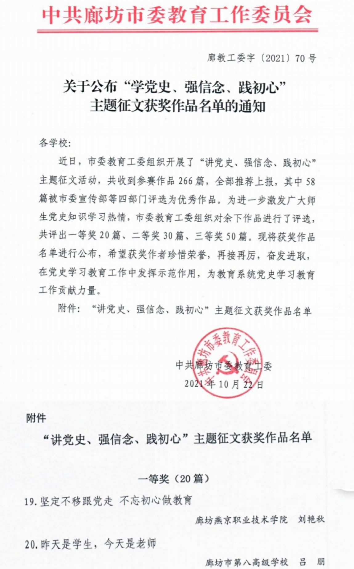 日前,中共廊坊市委教育工委印发《关于公布“学党史、强信念、践初心”主题征文获奖名单的通知》,其中计算机工程系专职辅导员老师刘艳秋撰写的《坚定不移跟党走 不忘初心做教育》荣获一等奖。