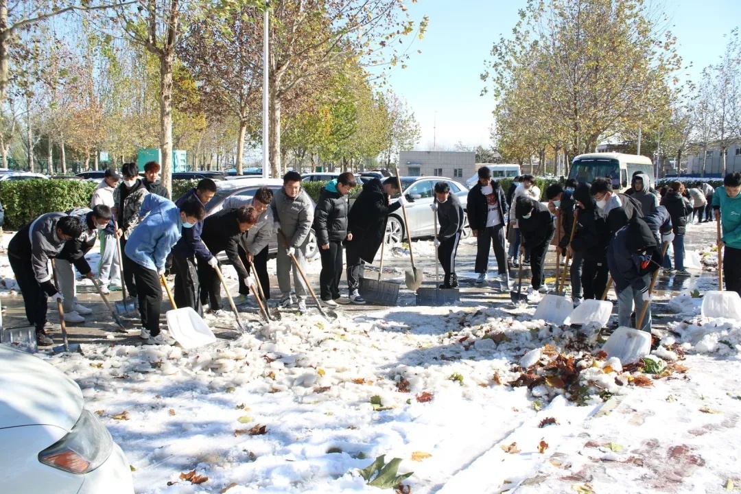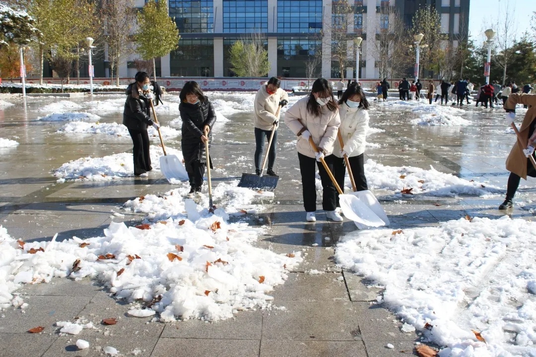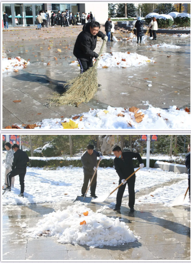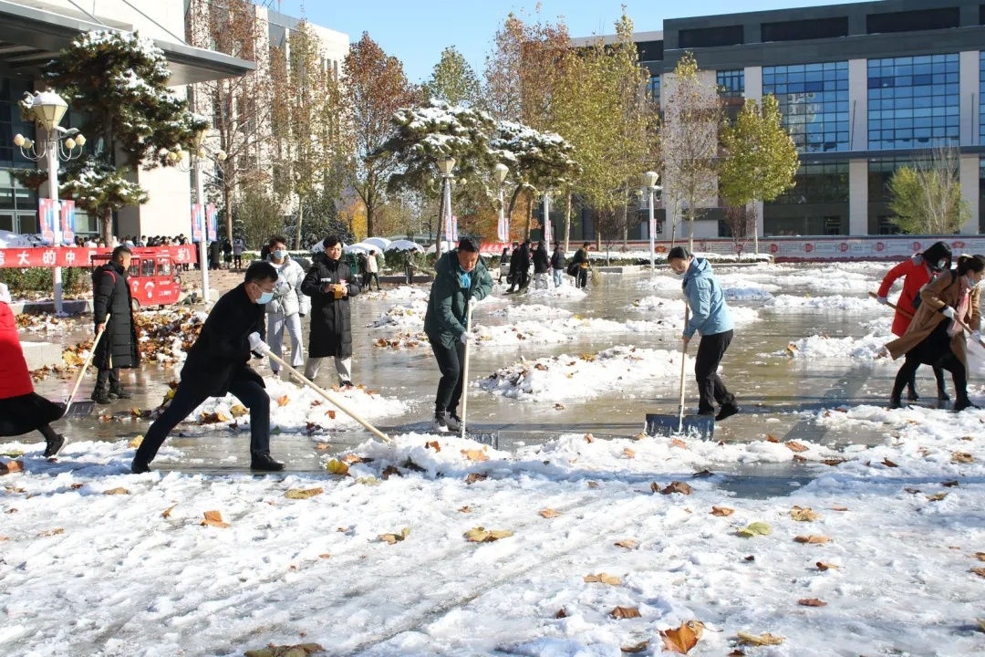 近日,受强冷空气影响,立冬节气,初雪飘然而至,一夜间,一场大雪将金年会app手机版在线登录校园点缀成银装素裹,玉树银花的世界。洁白无瑕的雪景不仅给人带来了美的享受,却也给人们的生活尤其是交通带来诸多不便。11月8日上午,学院积极组织领导干部和教职工对校园进行扫雪除冰活动。