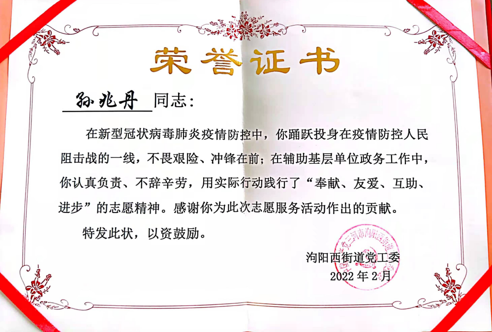 孙兆丹同志用实际行动诠释了一名共产党员在关键时刻与人民心手相依,守望相助的使命与担当。她的行为也受到了泃阳西街道党工委的肯定,先后两次为孙兆丹同志颁发了荣誉证书。