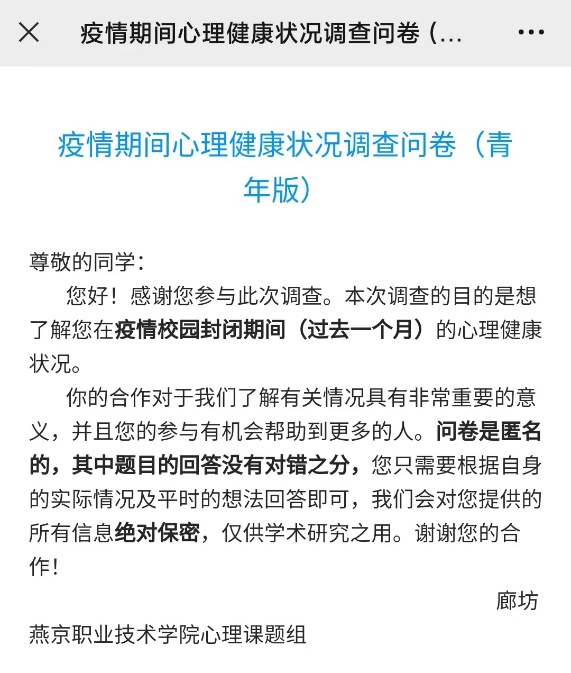 疫情当下,学生的心理健康问题尤其突出。为了全面了解学生容易出现的各种心理健康问题,制定更完善的辅导干预政策,以便帮助学生更好的适应疫情下的学习生活,老师们对395名学生进行了问卷测试,为有效开展大学生心理健康教育掌握了第一手资料。