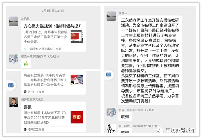 截至目前,廊坊市职业教育名师工作室的组建工作已经完成,35个名师工作室中已有34个工作室申请了公众号。中等职业学校中固安县职业技术教育中心王永然、固安县职业中学徐书香、霸州市职成教育总校郑环宇、香河县职业技术教育中心张美荣、廊坊电子信息工程学校田丽娟,高等职业学校中廊坊职业技术学院杨开红、刘会珍,廊坊卫生职业学院王冬、王金凤,金年会app手机版在线登录职业技术学院李若冰、王金环等11个工作室先后开展了实质性的教科研活动。