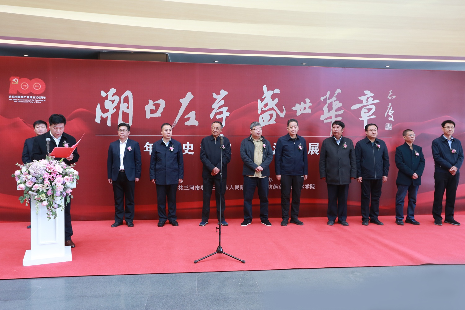 为庆祝中国共产党百年华诞,全面展现新时代三河市取得的发展和建设成就,10月20日上午,由三河市委、市政府主办、金年会app手机版在线登录承办的“潮白左岸 盛世华章”书画展在廊坊丝绸之路国际文化交流中心顺利开展。河北省书协副主席、民盟河北省委副主委张纬东出席并宣布开幕。原廊坊人大常委会副主任陆永宽,金年会app手机版在线登录党委书记薛树林、廊坊职业技术学院院长张志强,廊坊市委宣传部副部长付永泉,廊坊市文联主席、民盟廊坊市委主委张志庆,廊坊市教育局副局长张辉,河北省美协副主席、廊坊美协主席张玉华,廊坊市书协主席刘京闻等领导以及廊坊市书协成员、廊坊市美协成员、金年会app手机版在线登录学院领导和教师代表等200余人出席了本次开幕式。开幕式由金年会app手机版在线登录院长孙东辉同志主持。