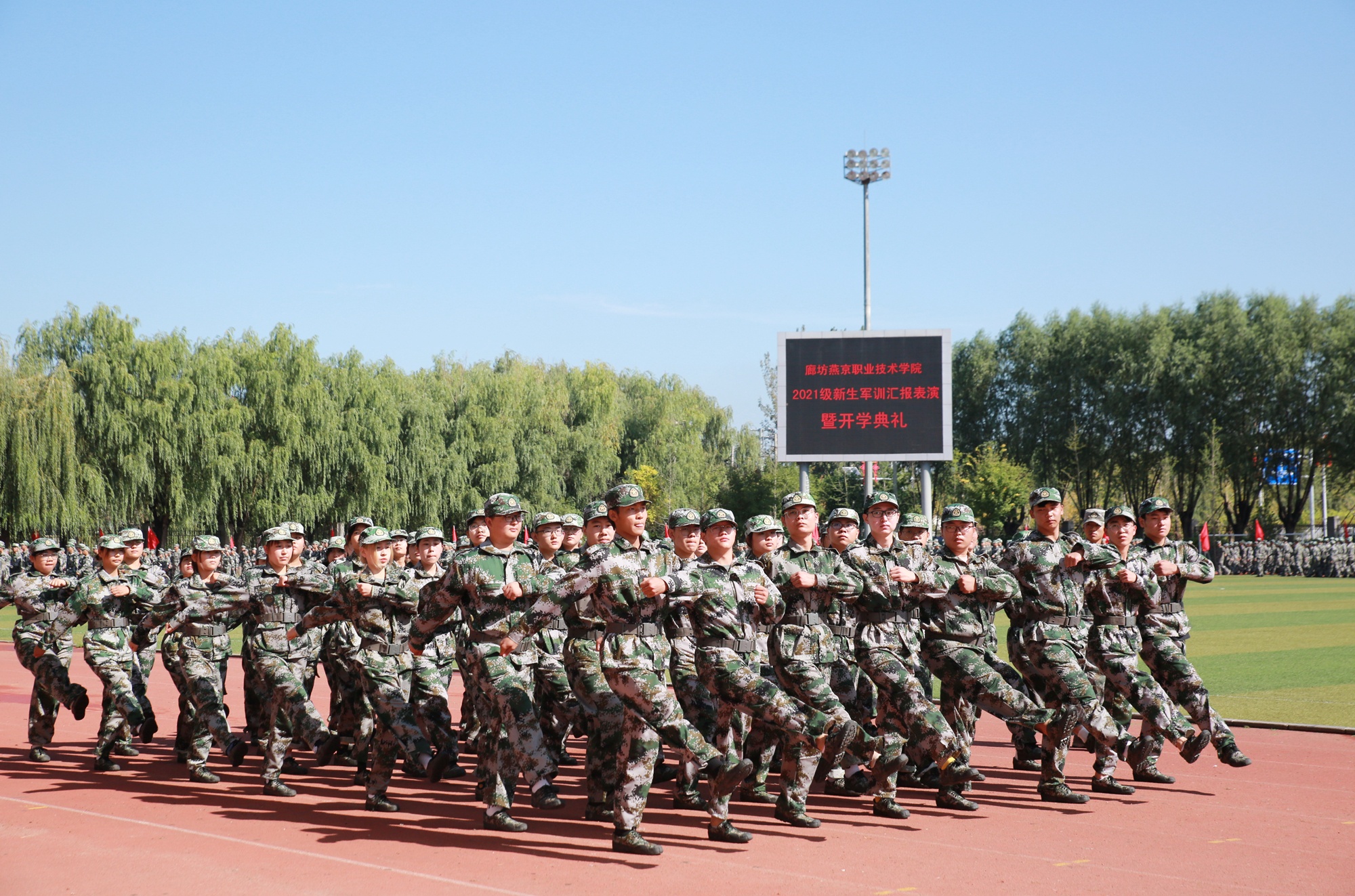 随着院长孙东辉同志发布分列式及军训汇报表演开始的指令,1600余名新生,迈着整齐的步伐依次通过主席台,他们用飒爽的英姿,昂扬的姿态,高亢有力的口号,为期十天的军训生活画上了圆满的句号。随后,新生们进行了军体拳、捕俘刀、队列操等汇报表演,博得阵阵喝彩和掌声。