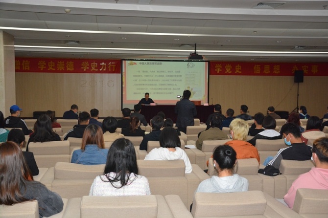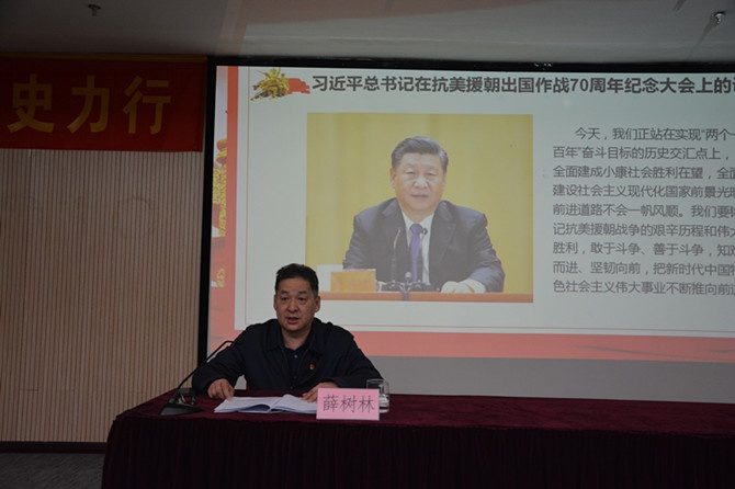 薛书记以“弘扬抗美援朝精神,激发时代使命担当”为题,围绕抗美援朝战争的历史背景;抗美援朝战争著名战役;抗美援朝战争涌现出英雄人物三部分展开宣讲。宣讲从播放《中国人民志愿军军歌》开始,歌声响起,全体师生被迅速带回到志愿军雄赳赳、气昂昂,跨过鸭绿江赴朝作战那个年代。宣讲回顾了1950年党中央和毛主席果断作出抗美援朝伟大战略决策的整个过程;介绍了中国人民志愿军在总司令兼政委委员彭德怀同志的带领下,历时三年零九个月的战斗中经历过的著名的云山战斗、上甘岭战役、长津湖战役、清川江围歼战、金城战役和志愿军战士在这些战役中表现出的英勇无畏的斗争精神;分析了抗美援朝战争中涌现出的英雄人物毛岸英、杨根思、黄继光、孙占元、邱少云、罗盛教、杨育才、张桃芳、王海和他们的英雄事迹。同时,薛书记也介绍了自己父亲作为入朝的铁道兵亲手参与修好跨江铁路的情况。