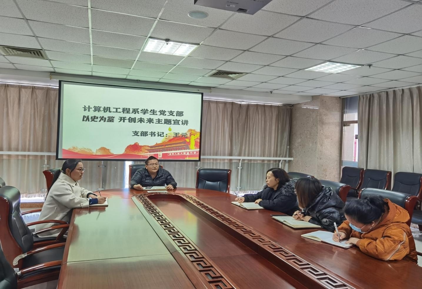在先期深入学生宿舍宣讲的同时,教师党支部书记艾华同志、学生党支部书记王元同志继续推动支委、党员学习宣讲,他们分别以“学习贯彻全会精神,汲取奋进智慧力量”,“以史为鉴 开创未来”为题面向支部委员宣讲和发动,一是要结合习近平总书记“七一”重要讲话精神和党史学习,深刻领会十九届六中全会精神,融会贯通;二是要求支委委员要先学一步、学深一层,吃透精髓后要深入班级带头宣讲;三是要加强理论学习,提高政治素养,结合实际工作,更好的发挥党支部的战斗堡垒作用和党员先锋模范作用。