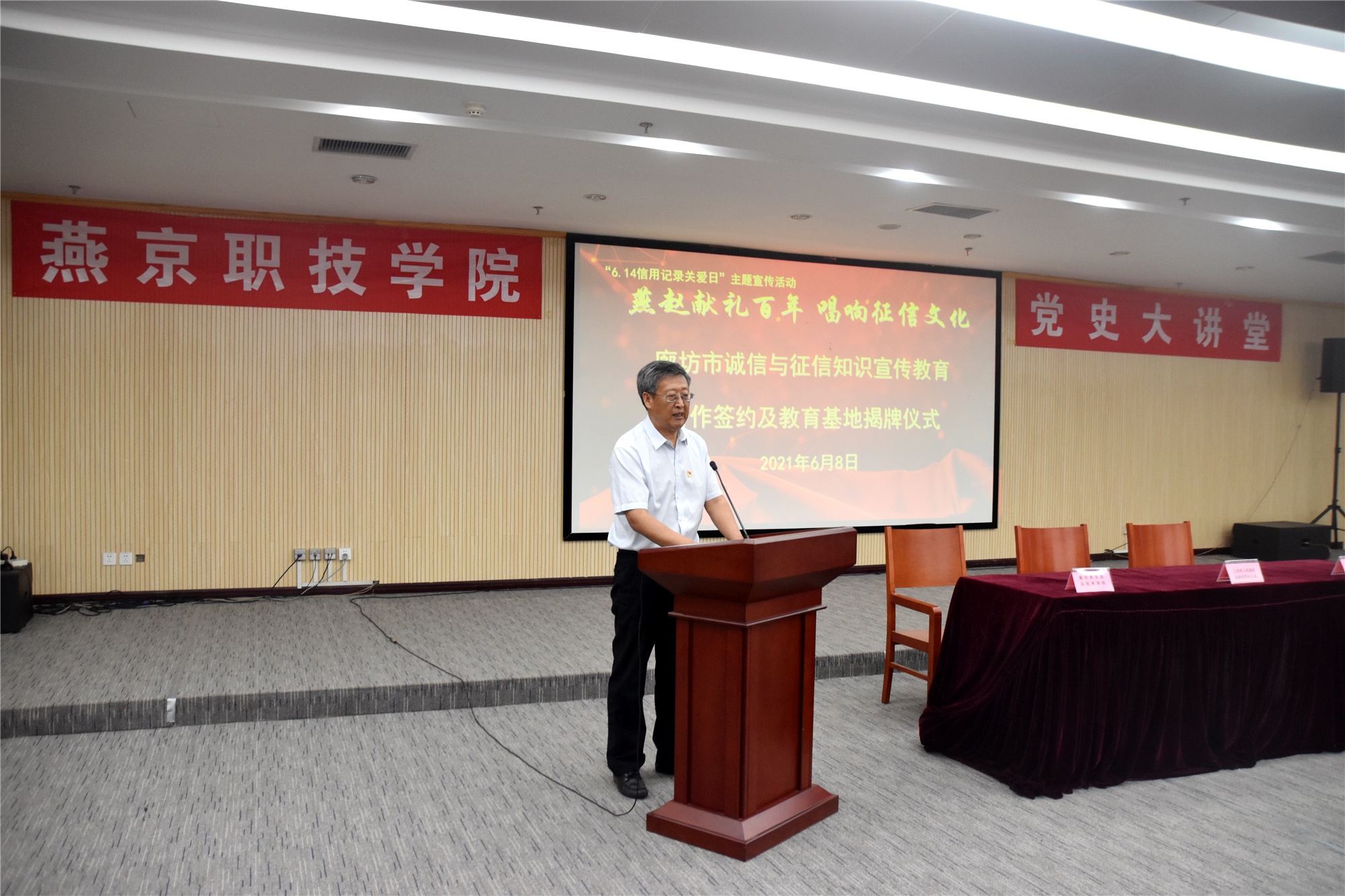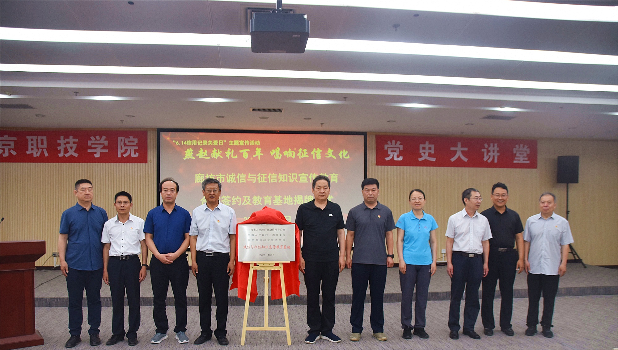 金年会app手机版在线登录自成立以来,以“德能兼修、知行并进”为办学理念,一直高度重视学生德育工作开展,逐步形成了注重培养诚信的校园文化特色。金年会app手机版在线登录与三河市人民政府金融信用办公室、中国人民银行三河市支行共同签署诚信与征信知识宣传教育合作签约,共建宣传教育基地,这是贯彻落实党的教育政策的具体举措,也是学院传承校园文化传统、服务区域经济社会发展的又一个有力措施。