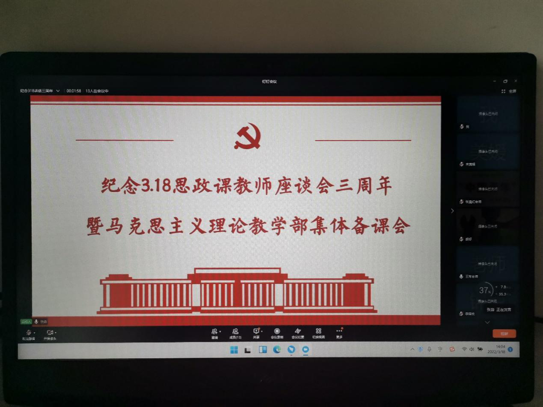 2022年3月18日是习近平总书记主持召开学校思想政治理论课教师座谈会并发表重要讲话三周年。为精准响应学院疫情防控要求,落实防疫主体责任,3月18日下午马克思主义理论教学部全体思政课教师利用专题网络会议形式,重温习近平总书记“3▪18”重要讲话精神,回顾了马克思理论教学部三年以来所取得成绩和经验,学习研讨如何全方位提升思政课教师的素质和能力,汇聚思政课创新力量,并对思政课教学工作进行再动员、再部署、再出发。马克思主义理论教学部副主任张淼主持会议。