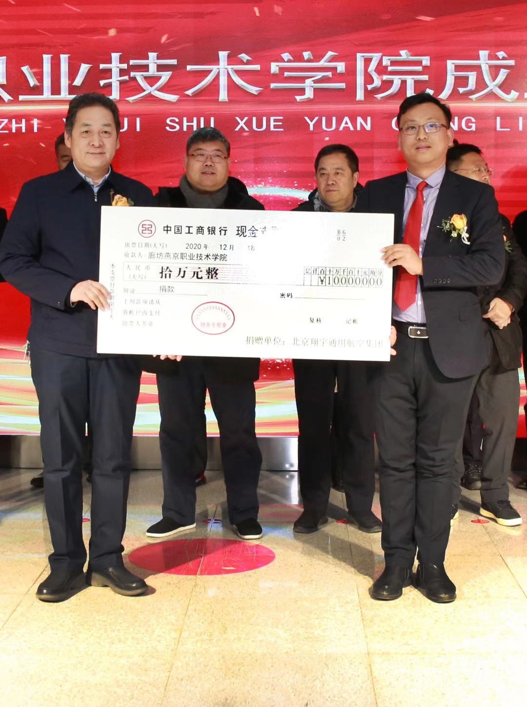 校企合作单位分别向学院表示了祝贺,并现场做出捐赠:北京翔宇通用航空集团捐赠十万元现金,北京商鲲教育控股集团捐赠五万元现金,河北新龙科技集团捐赠价值58万元教学设备,河北清博通昱公司捐赠价值30万元教学设备,中关村智酷双创有限公司捐赠价值27.4万元教学设备,北京韦加金年会技术有限公司捐赠价值10万元教学设备。
