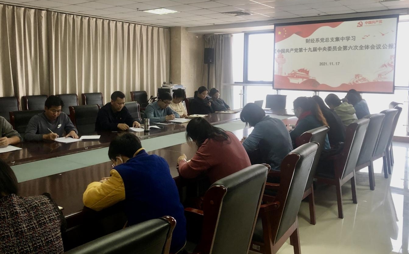 11月17日下午,财经系党总支在图书馆综合楼13层会议室召开扩大会议,集中学习《中国共产党第十九届中央委员会第六次全体会议公报》。财经系副主任、总支委员姜阀同志主持会议。财经系全体党员出席了会议。