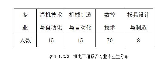 2.机电工程系共3个专业108人,其中焊机技术与自动化专业15人,机械制造与自动化专业15人,数控技术专业70人,模具设计与制造8人。见表1.1.2.2: