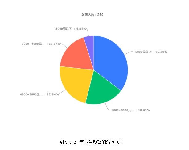 在被调查的289名毕业生中,102名毕业生期望薪酬在6000元以上,54名毕业生期望薪酬在5000-6000元,66名毕业生期望薪酬在4000-5000元,53名毕业生期望薪酬在3000-4000元,14名毕业生期望薪酬在3000元以下。具体见图3.3.2: