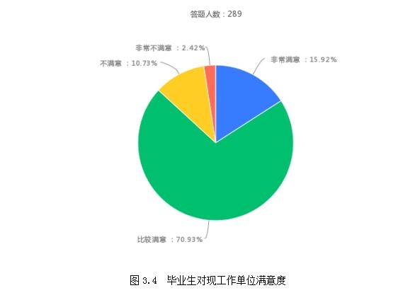 在被调查的289名毕业生中,46名毕业生表示对目前工作单位表示非常满意,约占被调查人数的15.92%,205名毕业生对目前工作单位表示比较满意,约占被调查人数的70.93%,31名毕业生对目前工作单位表示不满意,约占被调查人数的10.73%,7名毕业生对目前工作单位十分不满,约占被调查人数的2.42%。总体来说,毕业生对目前的就业单位还是比满意的。具体见图3.4: