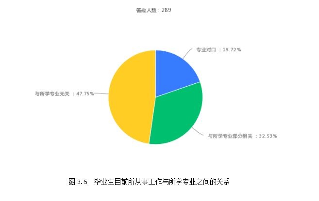 在被调查的289名毕业生中,57名毕业生所从事专业与所学专业对口,约占被调查人数的19.72%,94名毕业生所从事专业与所学专业不对口,但有部分关联,约占被调查人数的32.53%,138名毕业生所从事专业与所学专业完全不对口,约占被调查人数的47.75%。具体见图3.5: